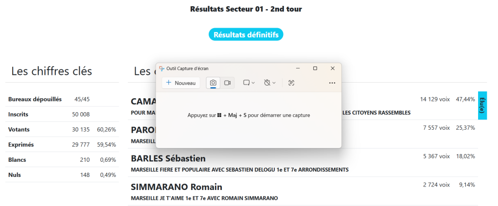 Après une campagne municipale intense, dans le cadre de la nouvelle loi Paris Lyon Marseille qui prévoit deux urnes (Une pour le Conseil municipal de la Ville de Marseille, Une pour la Mairie de secteur), nous sommes fiers d’avoir emporté une deuxième victoire :