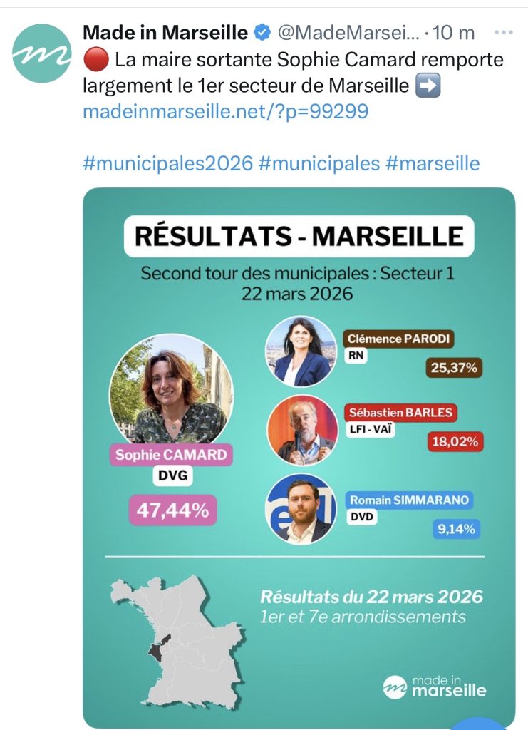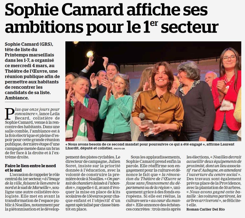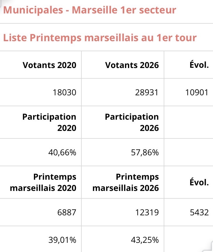 Dans le 1er secteur (1er-7ème arrondissements), la liste que j’ai eu l’honneur de conduire pour la deuxième fois a réalisé le meilleur score du Printemps marseillais au premier tour (43,26%), score qui s’est encore amélioré au second tour : 47,44% en quadrangulaire, et une progression de la participation. Des quadrangulaires ont eu lieu uniquement dans les 1er et 3ème secteurs.